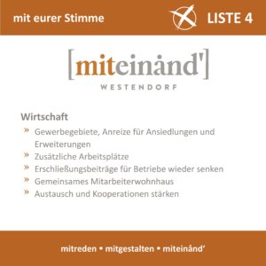 Durch die Wirtschaft kommt vor allem über die Kommunalsteuer Geld in die Gemeindekasse. Um Anreize zur Erweiterung bestehender Betriebe und für die Ansiedlung neue Gewerbebetriebe muss die Gemeinde unterstützend zur Seite stehen. Die Erhöhung der Erschließungbeiträge für Betriebe sollte dafür wieder rückgängig gemacht werden.